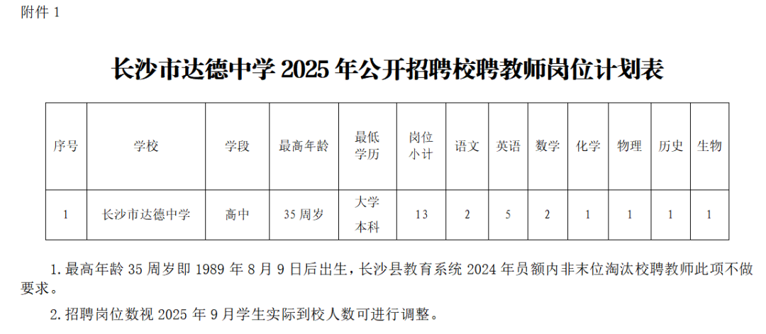 1.长沙市达德中学2025年公开招聘校聘教师岗位计划表